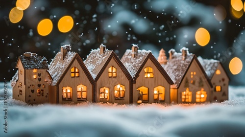 Wooden advent calendar shaped like a Christmas village, with holiday lights glowing in windows, placed on a background of soft snowfall