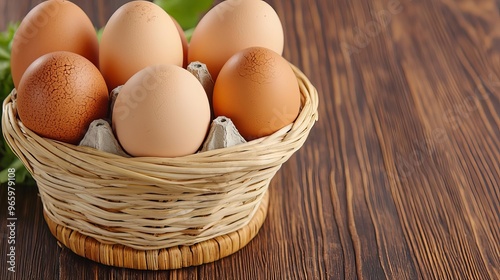 Wooden Base displaying farm-fresh eggs, woven basket, soft lighting, natural shadows, rustic countryside feel