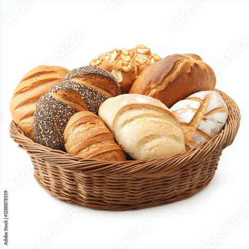 bread, food, basket, isolated, white, bakery, breakfast, baked, bun, brown, healthy, fresh, wheat, loaf, meal, pastry, tasty, snack, bake, wicker, traditional, easter, baguette