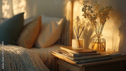 Wooden bedside table with books and reed diffuser in cozy bedroom
