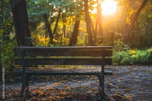 wooden bench on park near a forest with trees and beautiful light