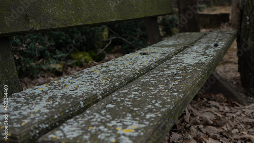 Wooden bench overgrown with moss in the park, rarely used, nature absorbs human creations