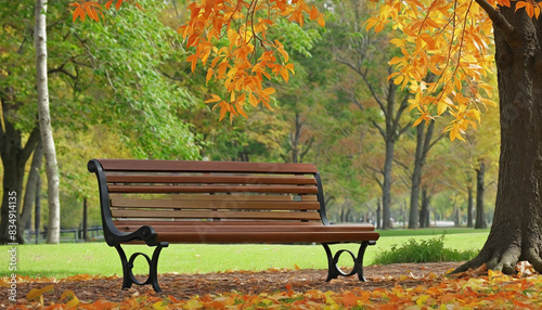 Wooden bench surrounded by vibrant autumn foliage in the park