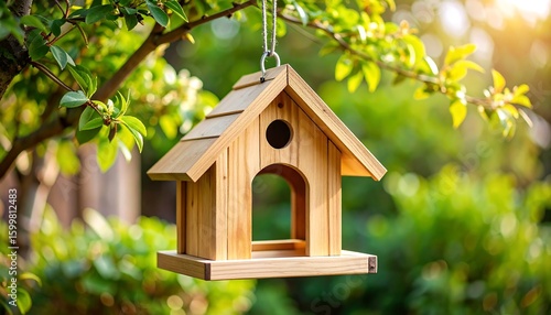 birdhouse, wooden, hanging, tree, tree branch, garden, nature, bird, summer, spring, sunlight, green, leaf, fresh, natural, closeup, detail, rustic, simple, design, cute, small, house, structure, shelter, home, eat, food, nesting, protection, nest, feather, flying, wing, decoration, peace, tranquil, relaxing, bright, warm, light, soft, sharpened, depth