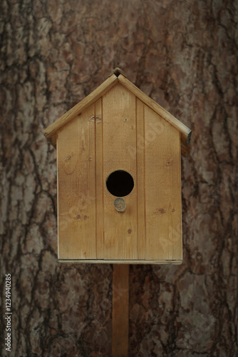 Wooden birdhouse on a tree close-up.