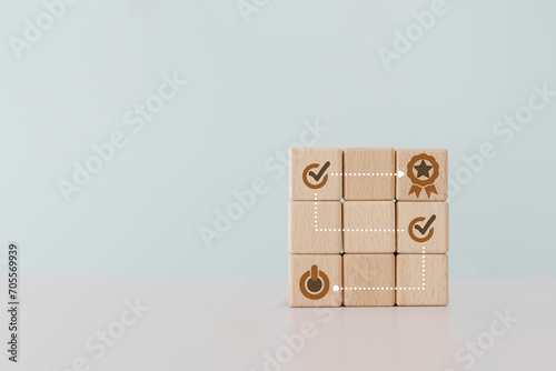 Wooden block with business management strategy with start and check icons. Project target plan, strategy planning management, business goal. Innovation and inspiration for creativity idea thinking