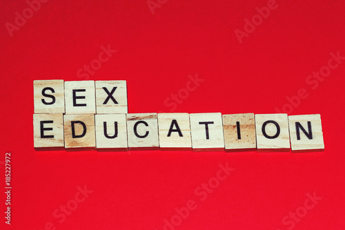 Wooden blocks on a red background spelling words Sex Education
