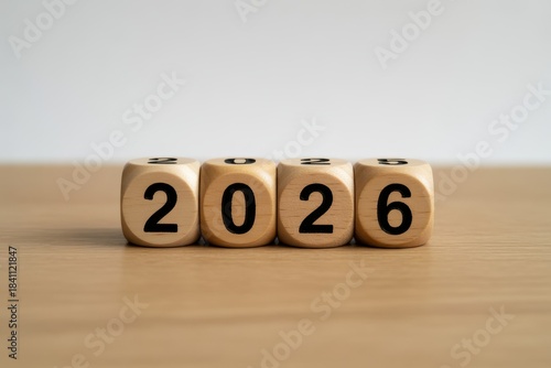 Wooden blocks spelling 2026 on a light wooden table, symbolizing the new year or future.