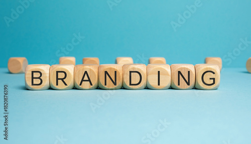 Wooden Blocks Spelling BRANDING on Blue Background.