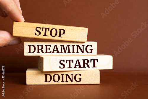 Wooden blocks with words 'Stop Dreaming Start Doing'.