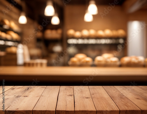 Wooden board empty table background. abstract blurred bakery shop background