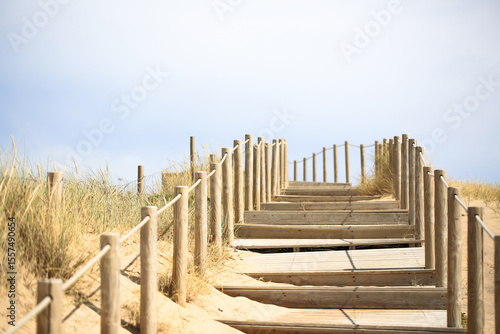 Wooden boardwalk pathway leading through sand dunes to the beach on a sunny day. Surrounded by tall grass and minimalistic fencing, this tranquil scene captures the natural beauty and peacefulness