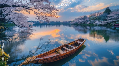 Wooden Boat Moored in a Serene Lake at Sunset with Cherry Blossoms