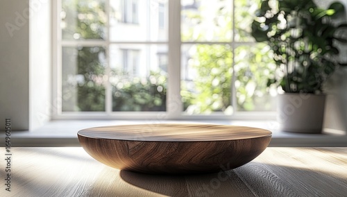 wood, bowl, table, window, sunlight, sunny, light, natural, warm, interior, home, kitchen, empty, modern, design, display, product, wooden, round, shape, smooth, brown, light brown, daylight, calm, peaceful, decor, minimalist, simple, clean, presentation, still life, image, photo, studio, surface, sharpened, blurred, background, plant, potted, green
