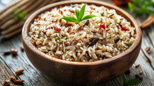 Wooden bowl, wild rice, rustic table, herbs, recipe