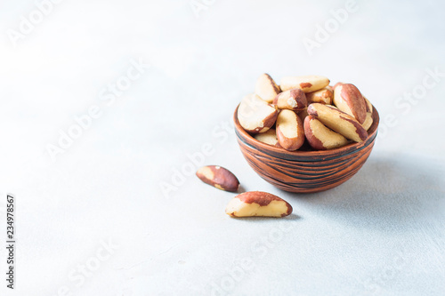 Wooden bowl with Brazil nuts on a light background. Healthy food.