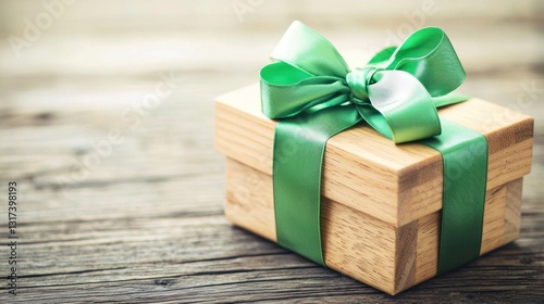 gift, present, box, wooden, ribbon, green, bow, attaching, knot, package, surprise, celebration, holiday, birthday, anniversary, special, occasion, festive, wrapped, delivery, rustic, vintage, texture, wood, surface, grain, plank, weathered, old, aged, tabletop, decor, design, simple, minimalism, elegant, delicate, light, shadow, background, object, element, template, blank, isolated, single, nobody