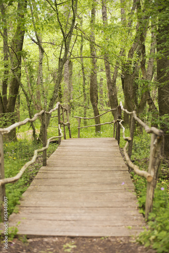 Wooden bridge in a forest. Wooden walkway in green forest near the Ropotamo river, Bulgaria