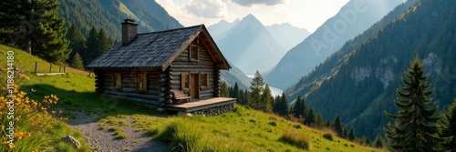 Wooden cabin in mountainous terrain with sunlight peeking through trees, forest, natural, dachstein