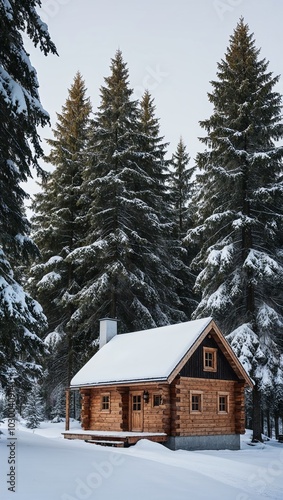 Wooden cabin in snow covered evergreen forest background for invitation or card screensaver