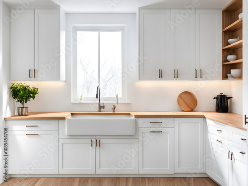 Wooden cabinets in bright minimal white kitchen interior with window.