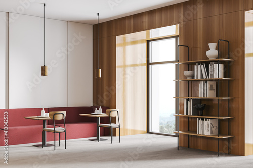 Wooden cafe with bookshelf and red sofa with chairs and lamps