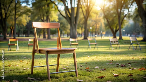 Wooden Chair with Black Ribbon in a Tranquil Park Setting at Sunset