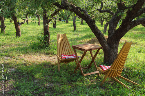 Wooden chairs and table under tree in a beautiful garden