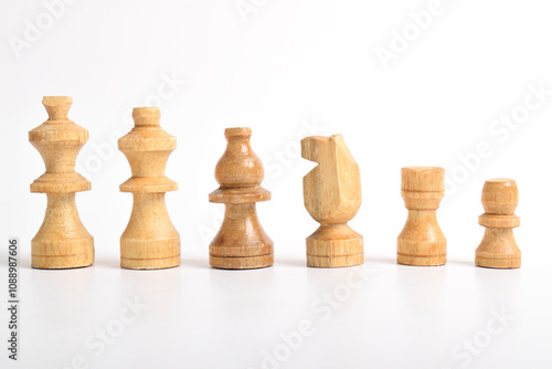 Wooden Chess set isolated on white backgound, chess piece king, queen, bishop, knight horse, rook, pawn. Business, Competition, Strategy, Decision concept