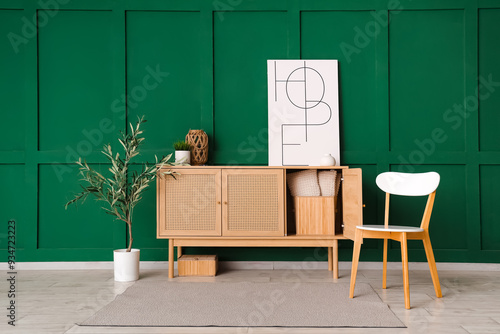 chair, chest, drawer, green, houseplant, living, room, wall, wooden, apartment, background, beautiful, box, carpet, colours, comfort, contemporary, cosy, decor, design, detail, domestic, dresser, element, fashion, flat, floor, furniture, home, house, indoor, interior, keeping, minimalism, minimalist, modern, nobody, object, picture, rug, storage, style, stylish, trend, trendy, vase, wicker