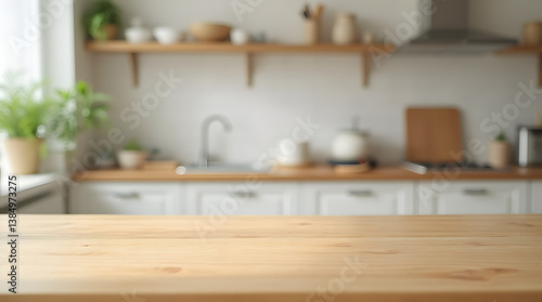 kitchen, modern, countertop, wooden table, interior, background, blur, bokeh, home, design, appliance, decor, soft light, plant, minimalist, clean, bright, elegant, stylish, cosy, furniture, shelf, utensil, oven, stove, natural light, topview, realistic, daylight, lifestyle, domestic, workspace, warm light, coffee machine, potted plants, homelike
