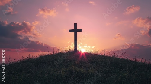 easter, cross, sunrise, sunset, christian, faith, spirituality, religion, prayer, hope, landscape, morning, nature, peaceful, sunlight, orange, yellow, mountain, hill, meadow, grass, flower, worship, sky, cloud, light, jesus christ, sacrifice, forgiveness, devotion, countryside, serene, symbolic, catholic, christianity, inspiration, hillside, rural, beauty, resurrection, holy, spring