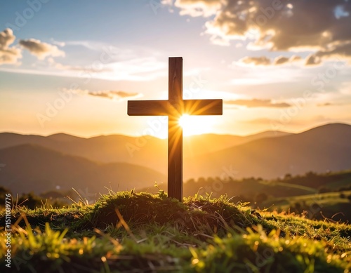 cross, wooden, sunset, hill, mountain, sky, cloud, grass, nature, light, faith, hope, peace, gold, vibrant, sun, ray, silhouette, religious, spiritual, outdoors, landscape, beautiful, tranquil, serene, majestic, view, horizon, sunbeam, calm, moment, devotion, elevation, powerful