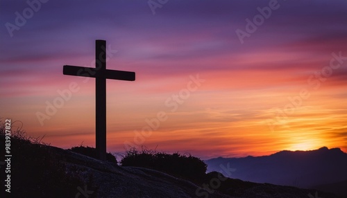 Wooden Cross on a Warm Sunset Background A wooden cross on the right, silhouetted against a vibrant sunset sky with hues of orange, pink, and purple, creating a spiritual, calming atmosphere.