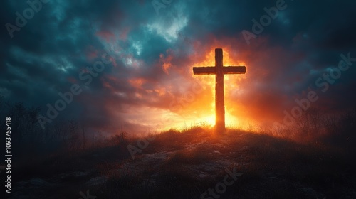 Wooden cross on hill with dramatic sunset, religious symbol, faith, Christianity, spiritual landscape, evening light, clouds, hope, peace, worship, silhouette