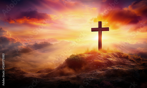 Wooden cross on hilltop at sunrise with vibrant clouds and rays of light
