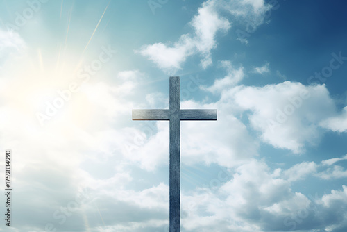 Wooden cross silhouetted against a bright sky with fluffy clouds, symbolizing faith and spirituality, radiating hope and serenity, ideal for spirituality, religion and meditation