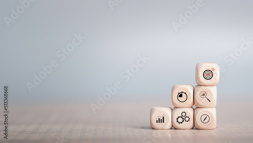Wooden cube step on table with icon Action plan, Goal and target, success and business target concept, project management, company strategy development.