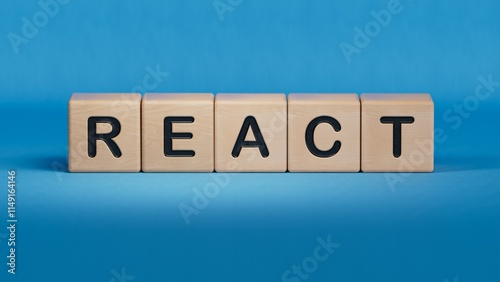 wooden cubes with text REACT. financial market. financing.close up of wooden elements,Business Concept.3D rendering on blue background.