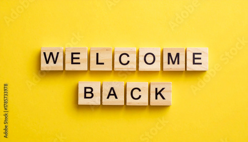 Wooden cubes with text WELCOME BACK on yellow background, friendly greeting concept, minimal