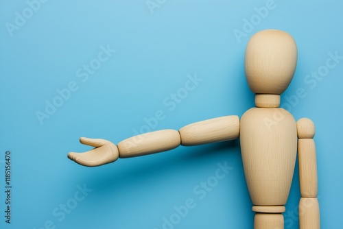 Wooden doll with gesture on blue background. Mannequin shows gesture. Figure of wooden human with copy space