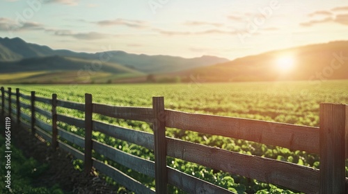 Wooden fence framing an expansive agricultural field under bright sunlight, creating a serene atmosphere with ample copy space for creative designs.