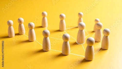 Wooden figures arranged in a network formation on a vibrant yellow backdrop