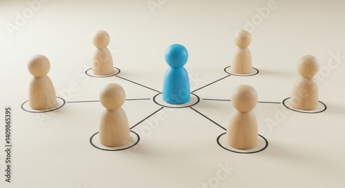 network, connection, leadership, blue, beige, communication, teamwork, collaboration, organisation, strategy, business, concept, social, community, management, structure, hierarchy, link, team, group, human relationships, influence, coordination, partnership, support, resource, system, planning, design, abstract, symbol, representation, figure, toy, object, arrangement, circle, connected, line, central, hub, node, leader, individual, unique