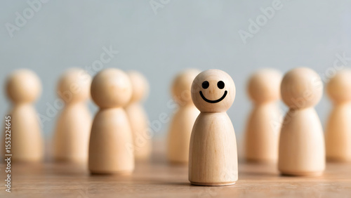 Wooden figurines showcase a positive attitude with happy face in business settings, emphasizing leadership, teamwork, and a focus on success among colleagues.