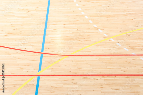Wooden floor basketball, badminton, futsal, handball, volleyball, football, soccer court. Wooden floor of sports hall with marking lines on wooden floor indoor, gym court