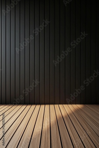 Wooden floor with a dark wall background, wood slats, wooden strips, a dark gray background