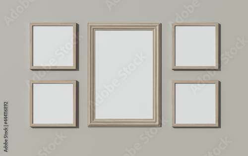 Wooden frames on painted wall. 3D render square wooden frame mock up. Empty interior. Blank. 3D illustration. 3D design interior. Template for business.