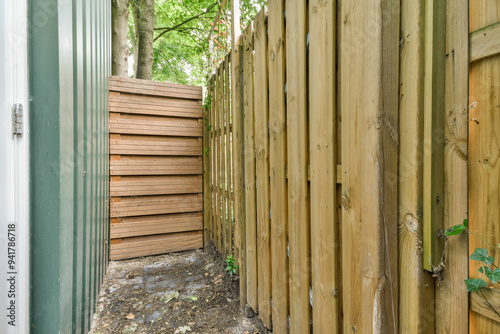 alley, fence, greenery, narrow, path, wooden, natural, barrier, entrance, privacy, security, back alley, garden, foliage, leaf, tree, spring, summer, contrast, new, old, texture, nature, architecture, suburban, residential, exterior, gate, improvement, renovation, landscaping, paseo, passage, access, property, boundary, secluded, tranquil, peaceful, rustic, pathway, environment, home, residential area