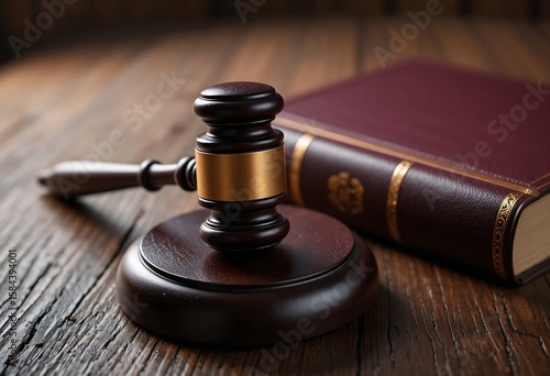 Wooden gavel and legal book on a polished wooden table, symbolizing justice and law.
